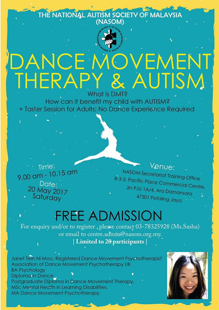 “DMT for children, teenagers, and adults with autism.” Free event open to parents and others interested. Register with the National Autism Society of Malaysia (NASOM).